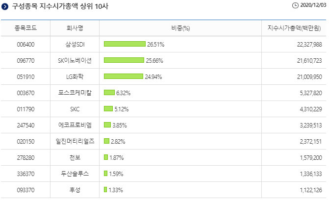 지수 상장 이후 첫 1달간은 다소 주춤했다가, 최근 1달간은 지속적으로 우상향 해왔음을 알 수 있습니다. 그만큼 2차전지에 대한 기대수요가 점점 커지고 있다는 말이겠지요.👍
