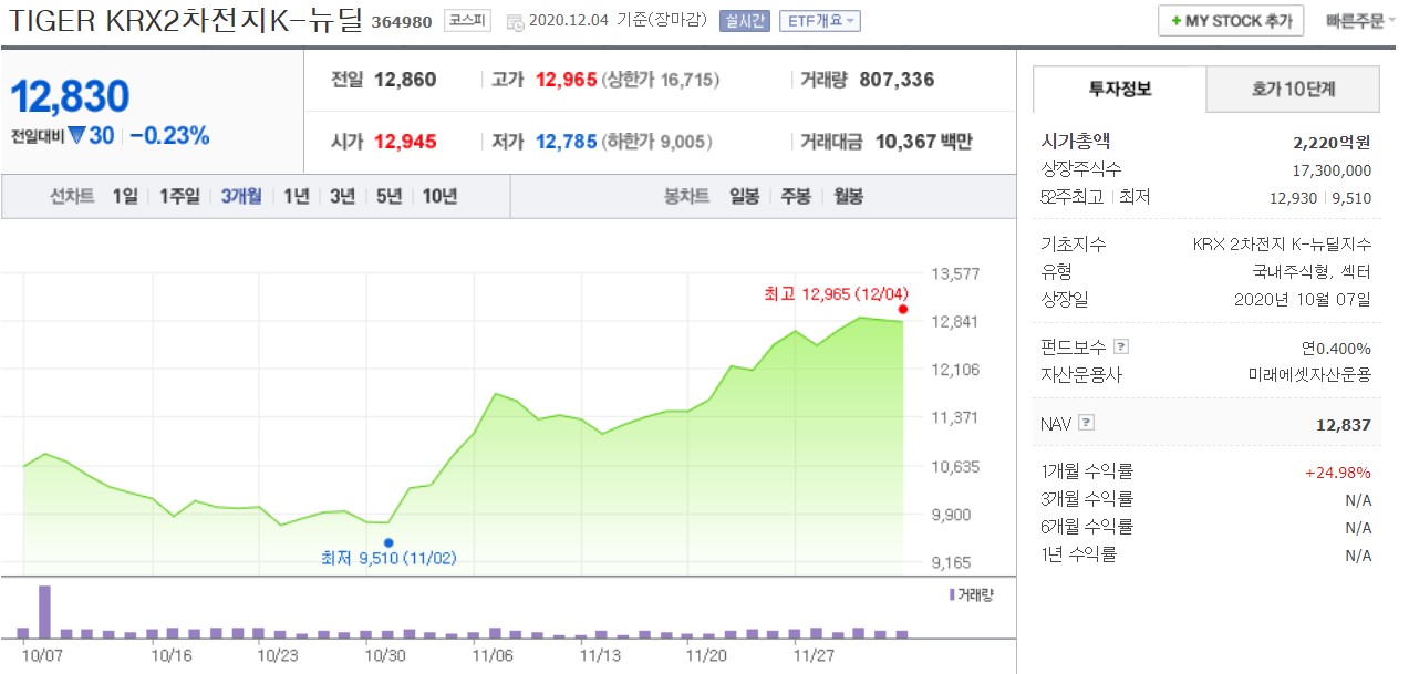 오늘 준비한 포스팅은 Tiger KRX 2차전지 K-뉴딜 ETF인데요! 얼마전에 소개드렸던 한국형 뉴딜의 일환으로 출시된 2차전지 산업분야에 집중된 ETF라고 보시면 되겠습니다!