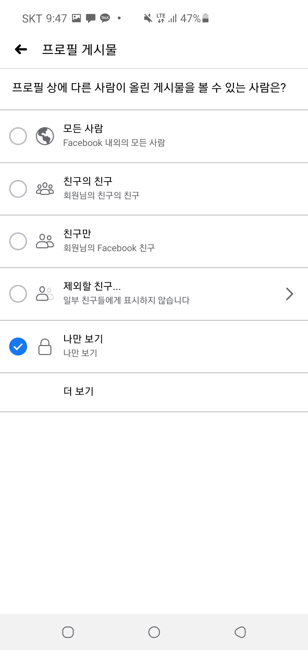 그럼, 여러분이 모르는 사람 혹은 원하지 않는 친구로부터 여러분들의 타임라인이 작성될 일은 없습니다! 추가로 여러분들의 프로필 작성자 범위도 설정할 수 있는데요!