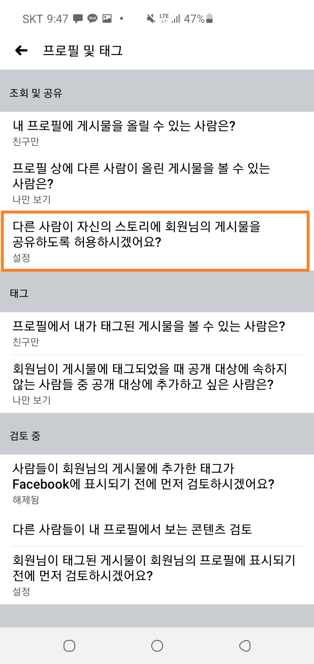 3. 프로필 및 태그에서 '다른사람이 자신의 스토리에 회원님의 게시물을 공유하도록 허용하시겠어요?'를 원하시는 공개범위로 설정해주세요!✋