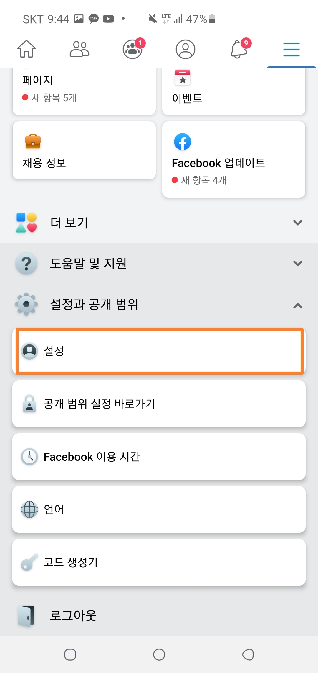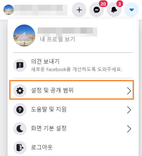 1. 우측 상단에 있는 三 메뉴를 클릭 - 설정과 공개범위 순으로 클릭해주세요!☝