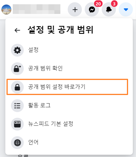 2. 그 다음, 설정 및 공개 범위 - 공개 범위 설정 바로가기 순으로 메뉴를 클릭해주세요!✌