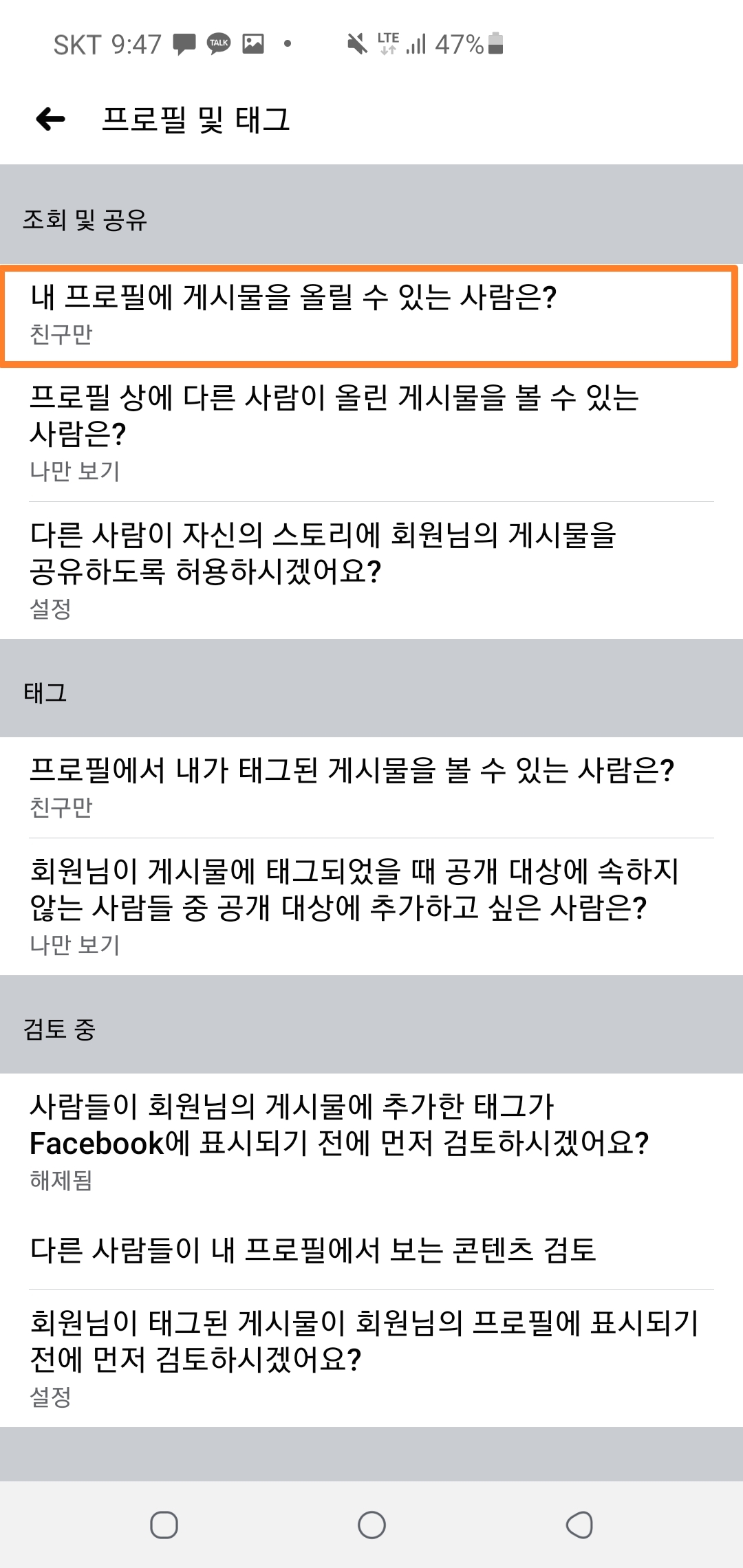 위 사진에서처럼 내 프로필에 게시물을 올릴 수 있는 사람도 설정할 수 있습니다! 타임라인 작성자 범위 설정만큼 범위를 세분화할 순 없지만 설정이 가능하다는 것! 여러분들도 알아주세요😉