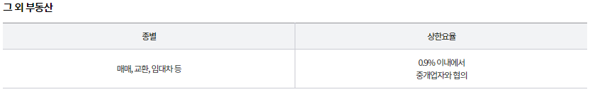 마지막으로 기타 부동산 건인데요! 주택과 오피스텔을 제외한 대표적인 부동산으로는 상가, 토지, 공장 등이 있겠습니다. 마찬가지로 위 요율을 참고하셔서 임대차, 매매 계약 진행하실 때 중개인에게 중개보수를 지불하면 되겠습니다.