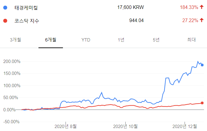 마찬가지로, 코스닥 지수 수익률을 넘지 못하고 있는 모습입니다. 확실히 대장주인 태경케미컬에 비해선 크게 주목을 받지 못하는 모습입니다.