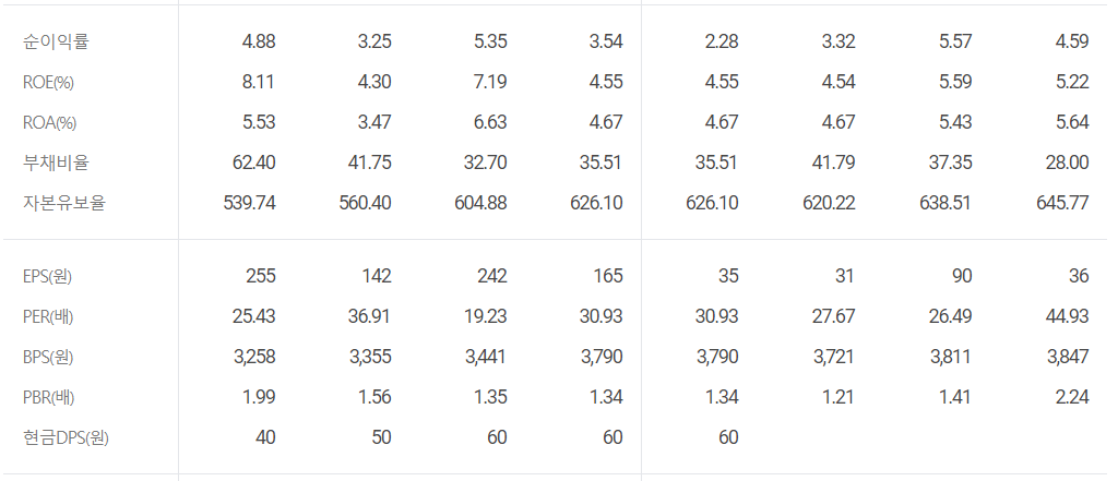 재무 구조도 전반적으로 양호합니다. PER의 경우도 10~30 내에서 형성하고있으나 종종 순이익률이 떨어져 영향을 끼치고 있는 모습입니다.😅