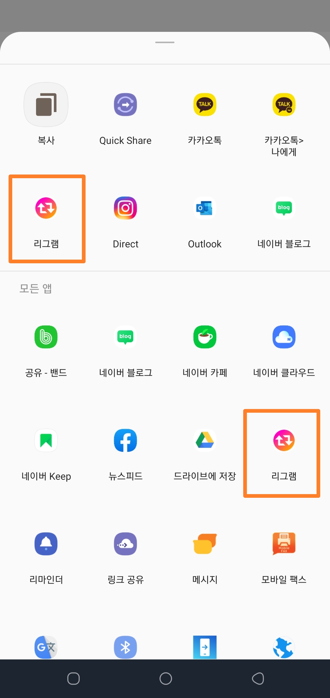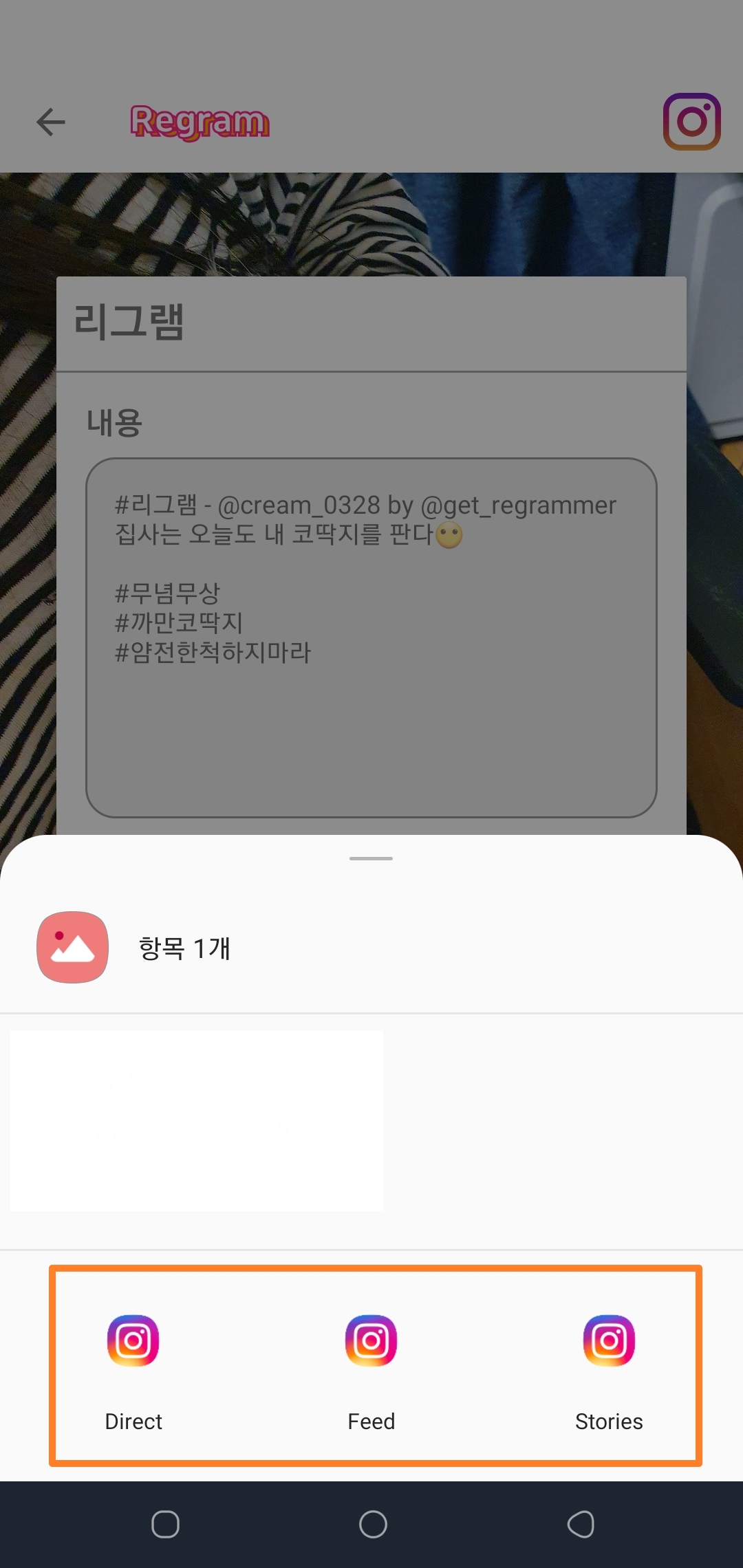 2. '리그램' 어플을 선택해서 공유를 해주시면 아까 인스타그램에서 '공유하기'하신 게시물이 나옵니다!