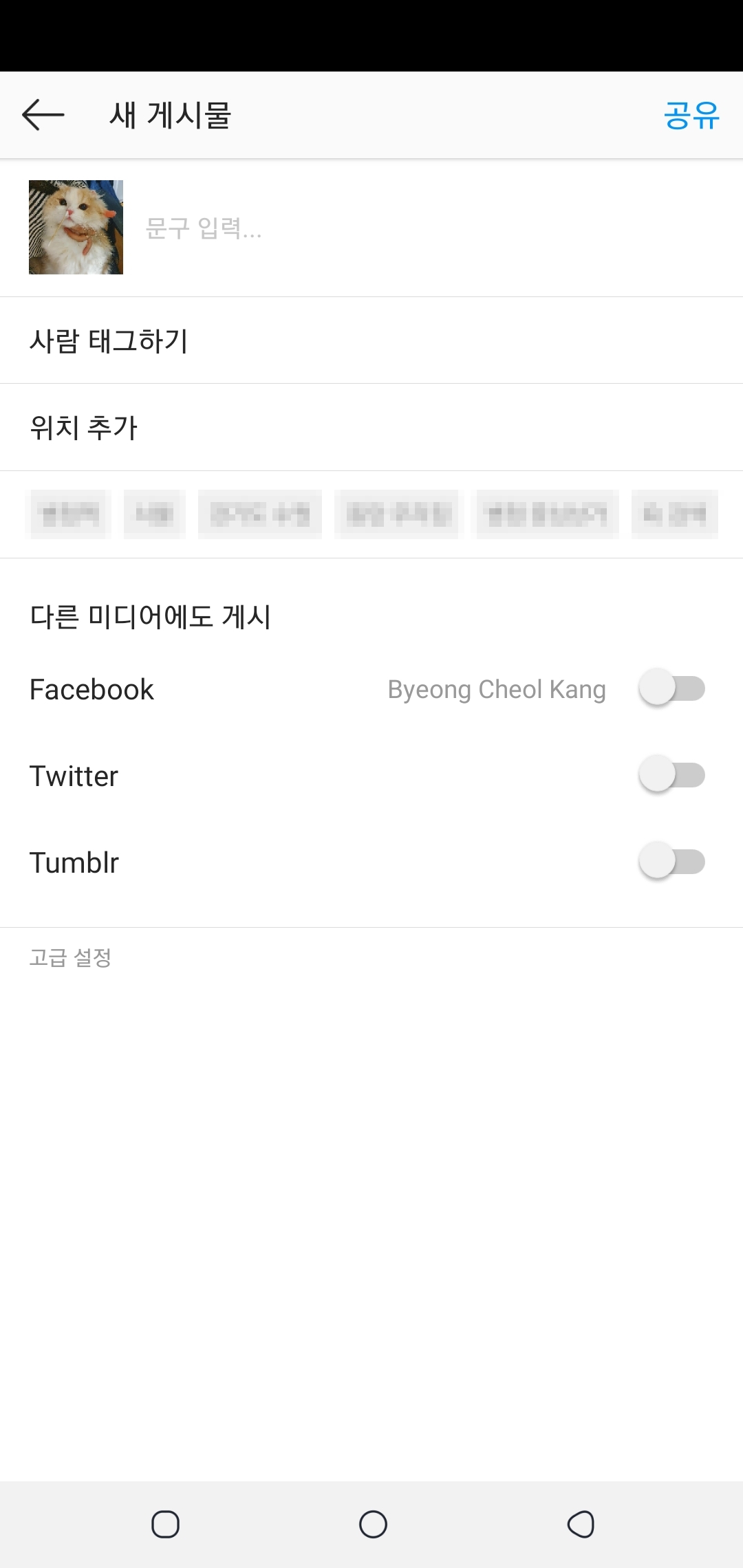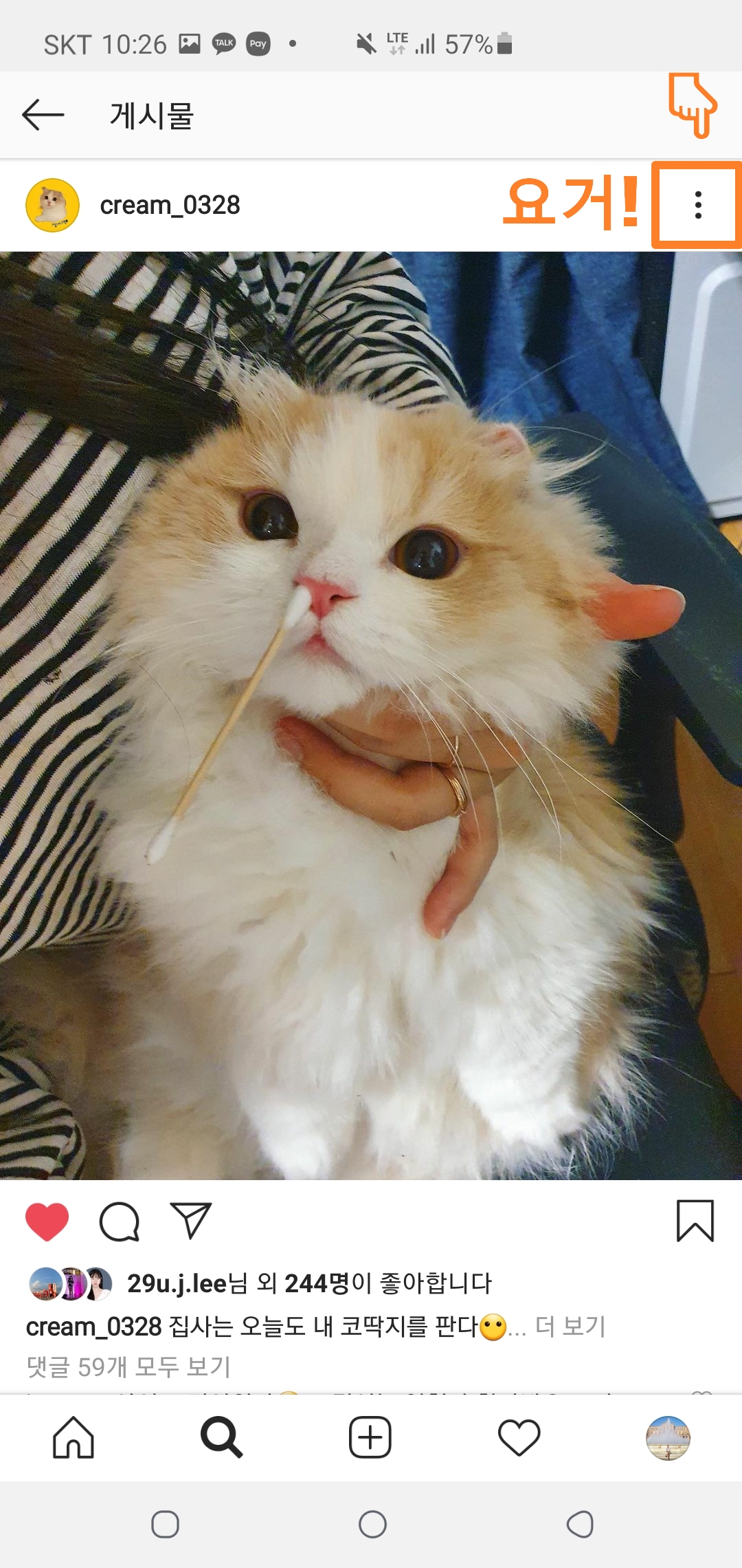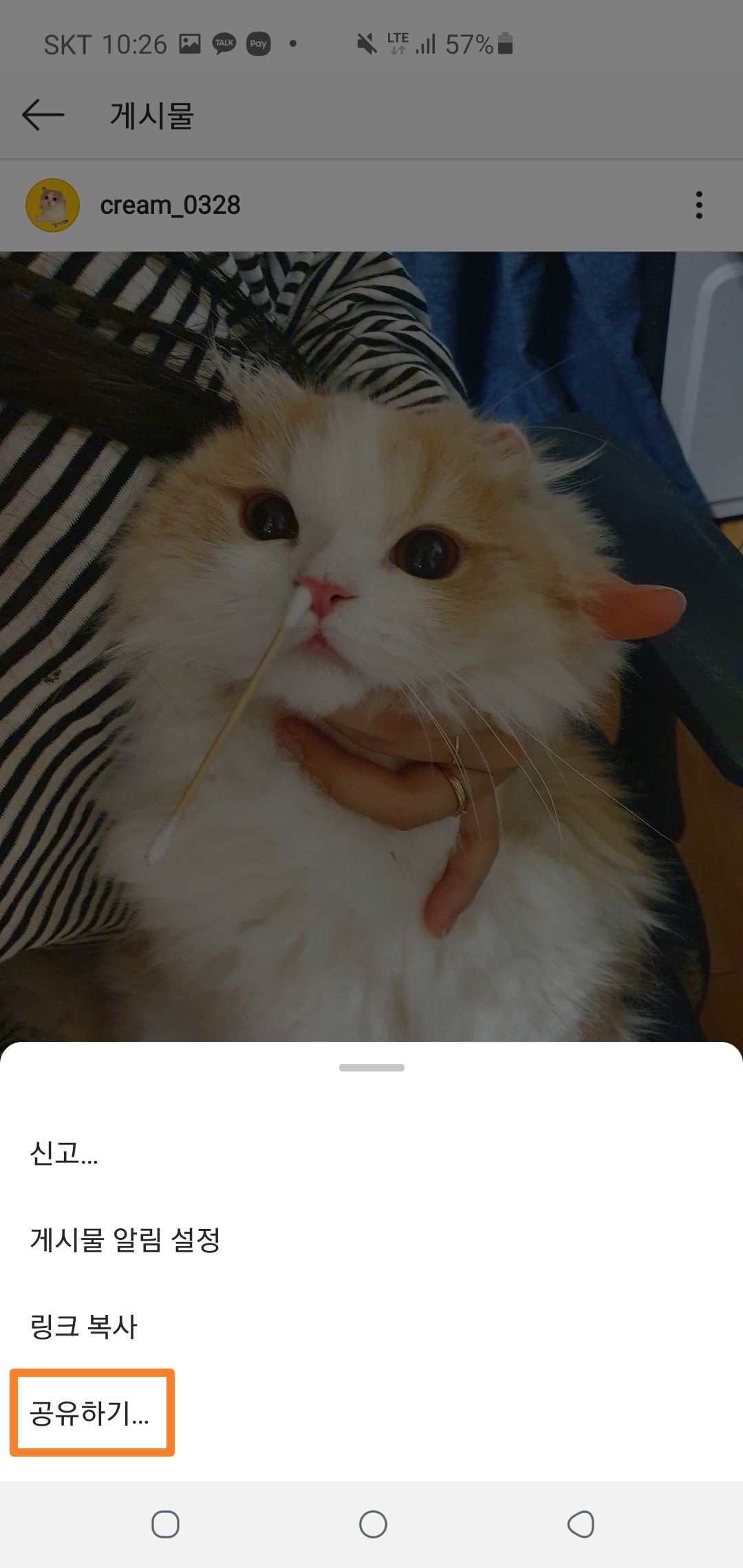 아래 귀여운 고양이 사진처럼 리그램을 하실 게시물의 우측 상단을 보시게 되시면, 점 세개가 있는 것을 확인하셨을거에요! 점 세개를 클릭하면 아래 추가기능 메뉴 옵션이 뜨게 되는데, 메뉴 중에 '공유하기'를 눌러주세요~✔