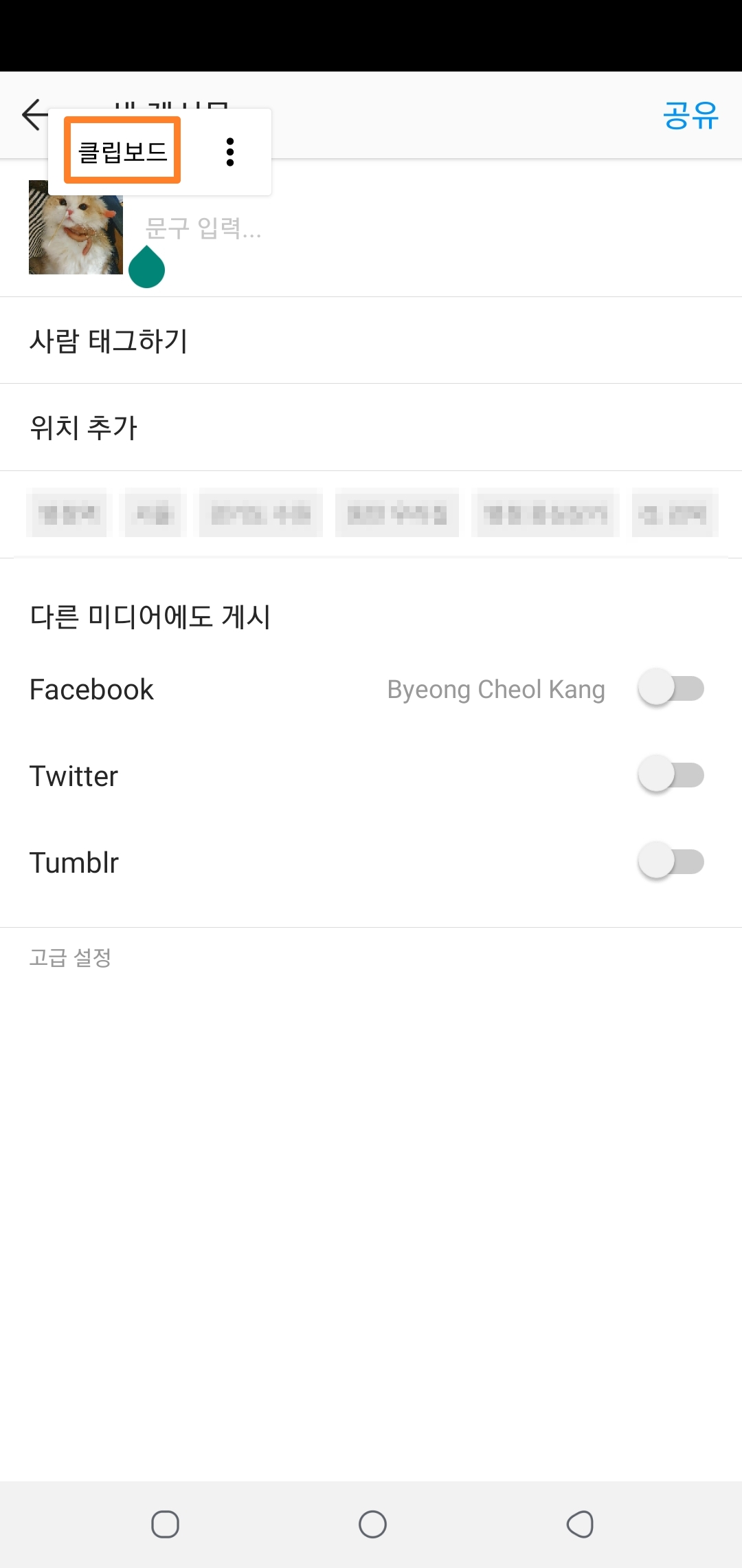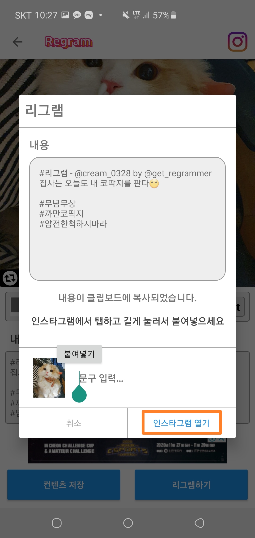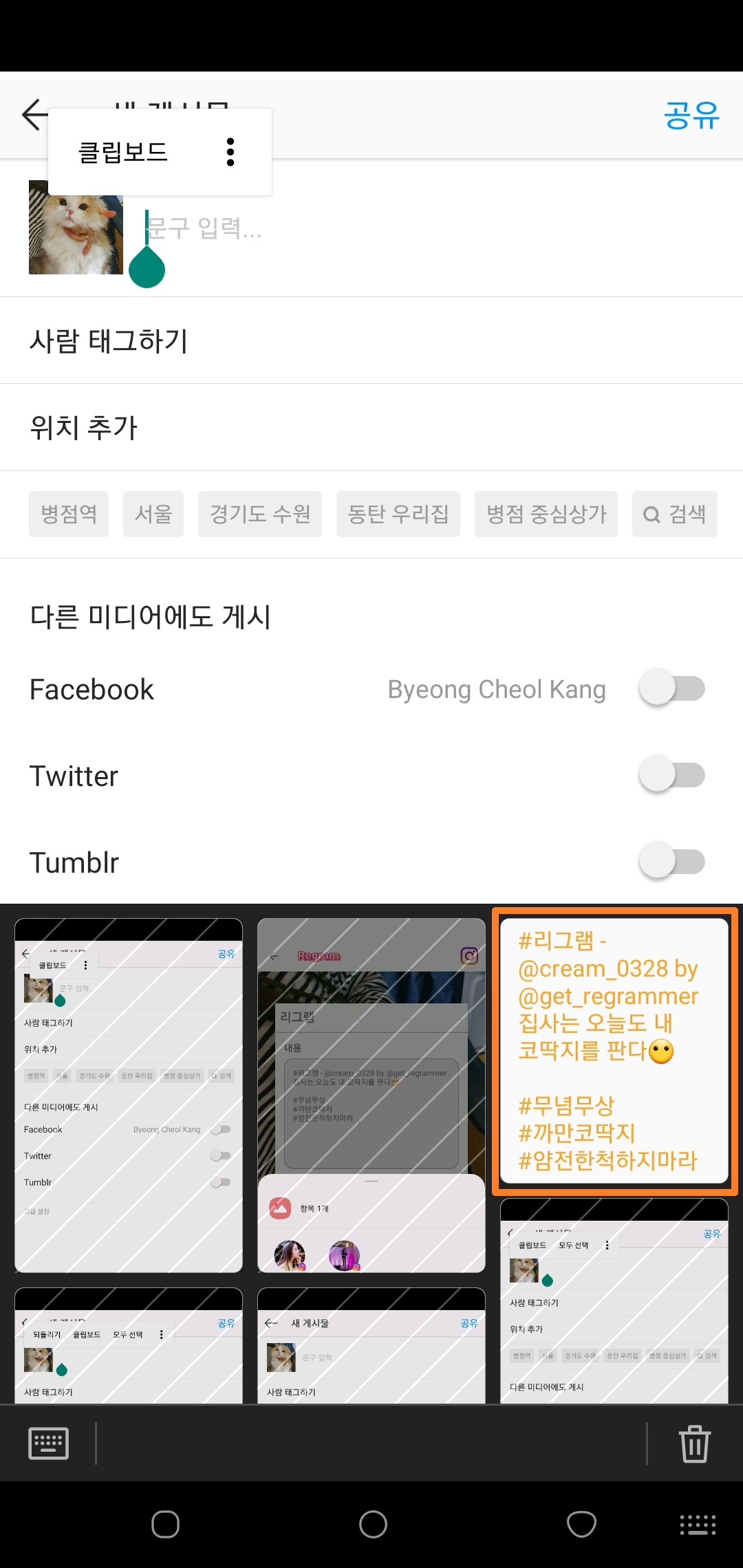 아래 사진에서 처럼, 마지막 리그램하고자 했던 게시물의 텍스트를 입력하는 방법을 설명드릴게요! 기본적으로 리그램하고자 하는 게시물의 텍스트 또한 클립보드에 저장이 되어있는데요! 아래 처럼 '문구입력'부분을 꾸욱 1초정도 눌러주시게 되면 클립보드 탭이 나오게 됩니다.