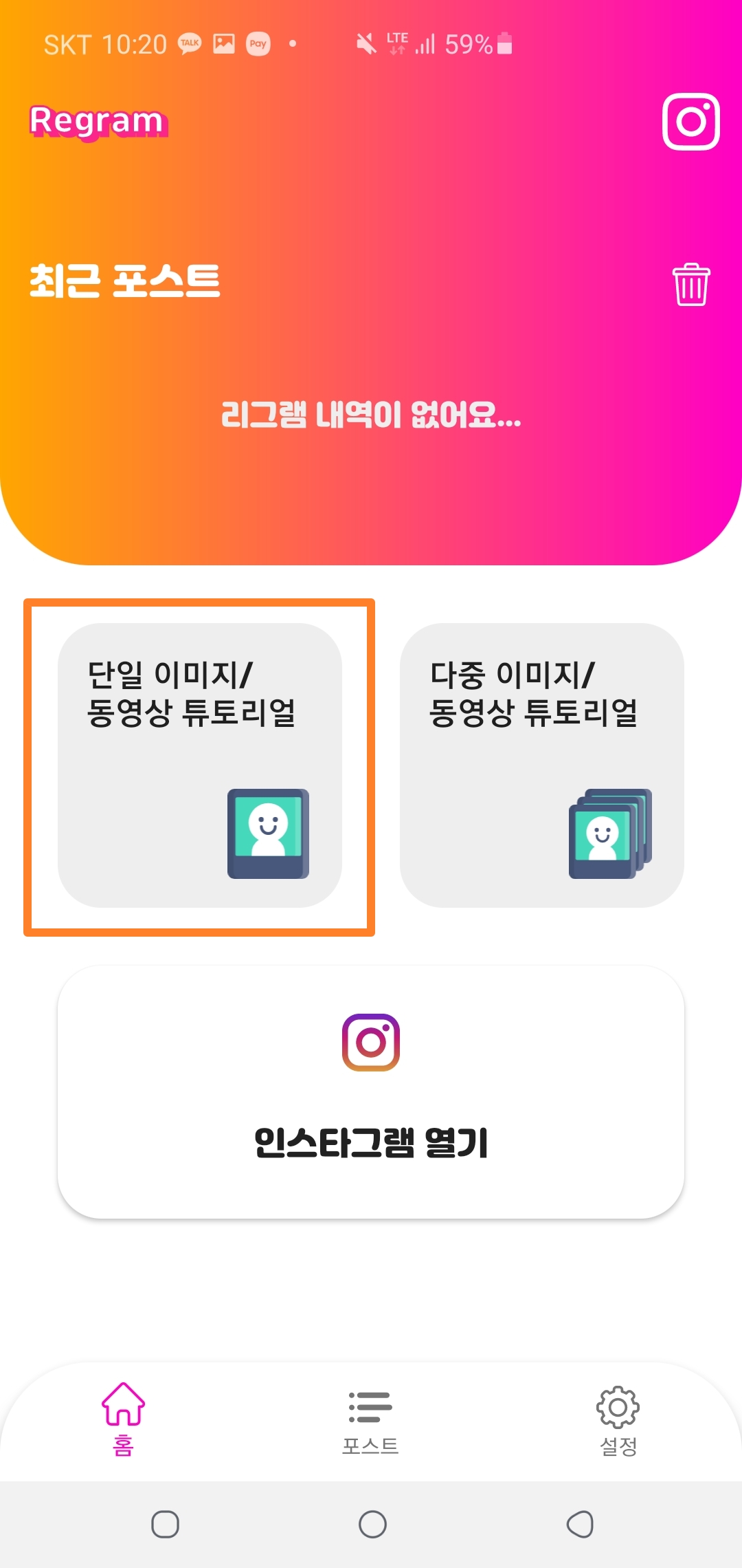 실제로 리그램이라는 어플을 열게되면 보시게될 화면인데요~ 아래 네모박스 표시한 '단일 이미지 / 동영상 튜토리얼'을 확인하시면 더욱 쉽게 이해하실 수 있으실겁니다