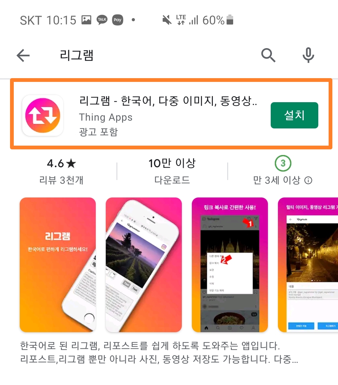 저같은 경우에는 아래 보여드리는 Thing Apps 사의 '리그램' 어플을 이용해보았는데요~ 플레이스토어에 들어가셔서 리그램이라고 검색하시면 가장 상단에 나타나더라구요! 참고로 절대 광고 하나도 안보탠 순수한 제 후기입니다 🤗