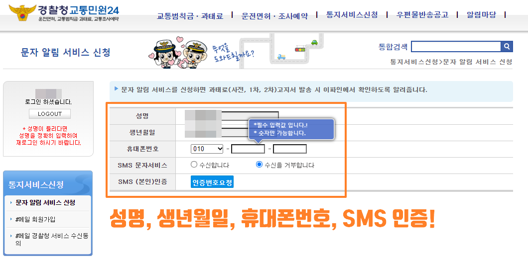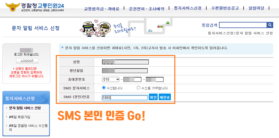 통지서비스신청 - 문자 알림 서비스 신청 - 개인 정보 & 휴대폰번호 입력 - SMS 인증