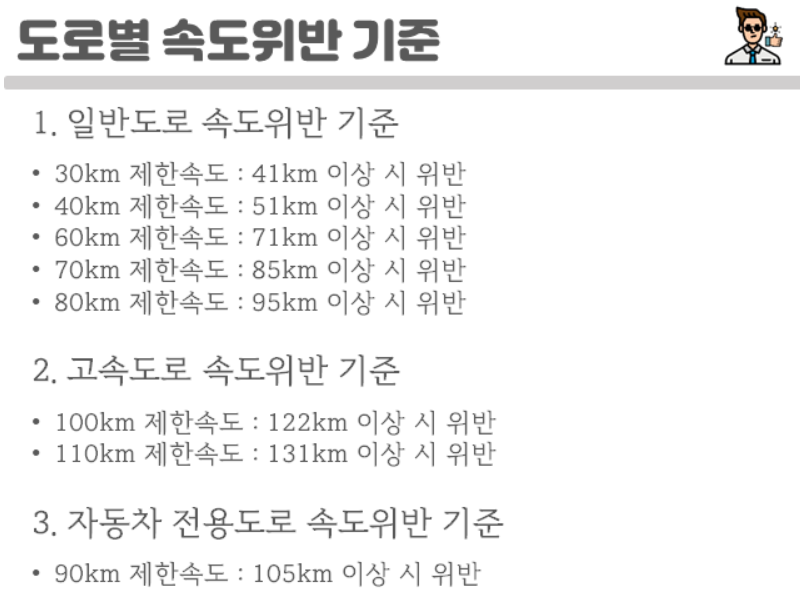 그리고 도로의 종류별 단속 기준도 조금씩 다릅니다. 일반도로에 적용되는 속도위반 기준과 고속도로에 적용되는 속도위반 기준, 자동차 전용도로에 적용되는 속도위반 기준이 서로 상이한데요!👏